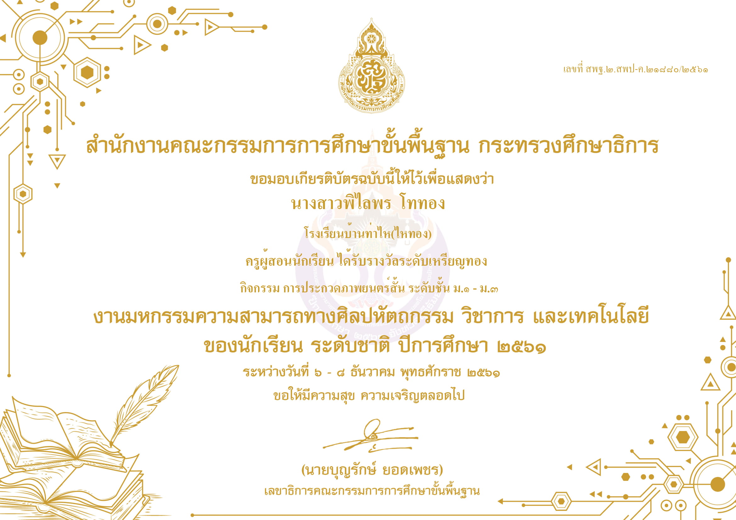 ชื่อผลงาน : ครูผู้ฝึกสอนนักเรียนได้รับรางวัลระดับเหรียญทอง กิจกรรม การประกวดภาพยนตร์สั้น ระดับชั้น ม.1-3 งานมหกรรมความสามารถทาง ศิลปหัตถกรรม วิชาการ และเทคโนโลยี ของนักเรียน ระดับชาติ ครั้งที่ 68 ปีการศึกษา 2561 ณ จังหวัดบุรีรัมย์