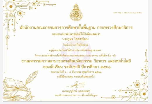 ครูผู้ฝึกสอนนักเรียนได้รับรางวัลระดับเหรียญทองแดง กิจกรรม การใช้เข็มทิศและการคาดคะเนและการสะกดรอย ระดับชั้น ป.4-6 งานมหกรรมความสามารถทาง ศิลปหัตถกรรม วิชาการ และเทคโนโลยี ของนักเรียน ระดับชาติ ปีการศึกษา 2561 ณ จังหวัดบุรีรัมย์ |