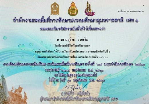 ชื่อผลงาน : ครูผู้ฝึกซ้อมคำคมได้รับรางวัลรองชนะเลิศอันดับหนึ่ง ชั้น ป.4-6 ระดับเขต