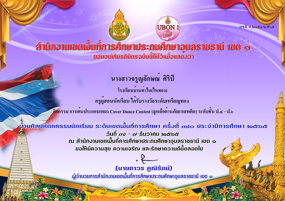 ชื่อผลงาน : ครูผู้สอนนักเรียน ได้รับรางวัลระดับเหรียญทอง กิจกรรม การเต้นประกอบเพลง Cover Dance Contest (ลูกเสือต้านภัยยาเสพติด) ระดับชั้น ป.4-ป.6 งานศิลปหัตถกรรมนักเรียน ระดับเขตพื้นที่การศึกษา ครั้งที่ 70 ประจำปีการศึกษา 2565
